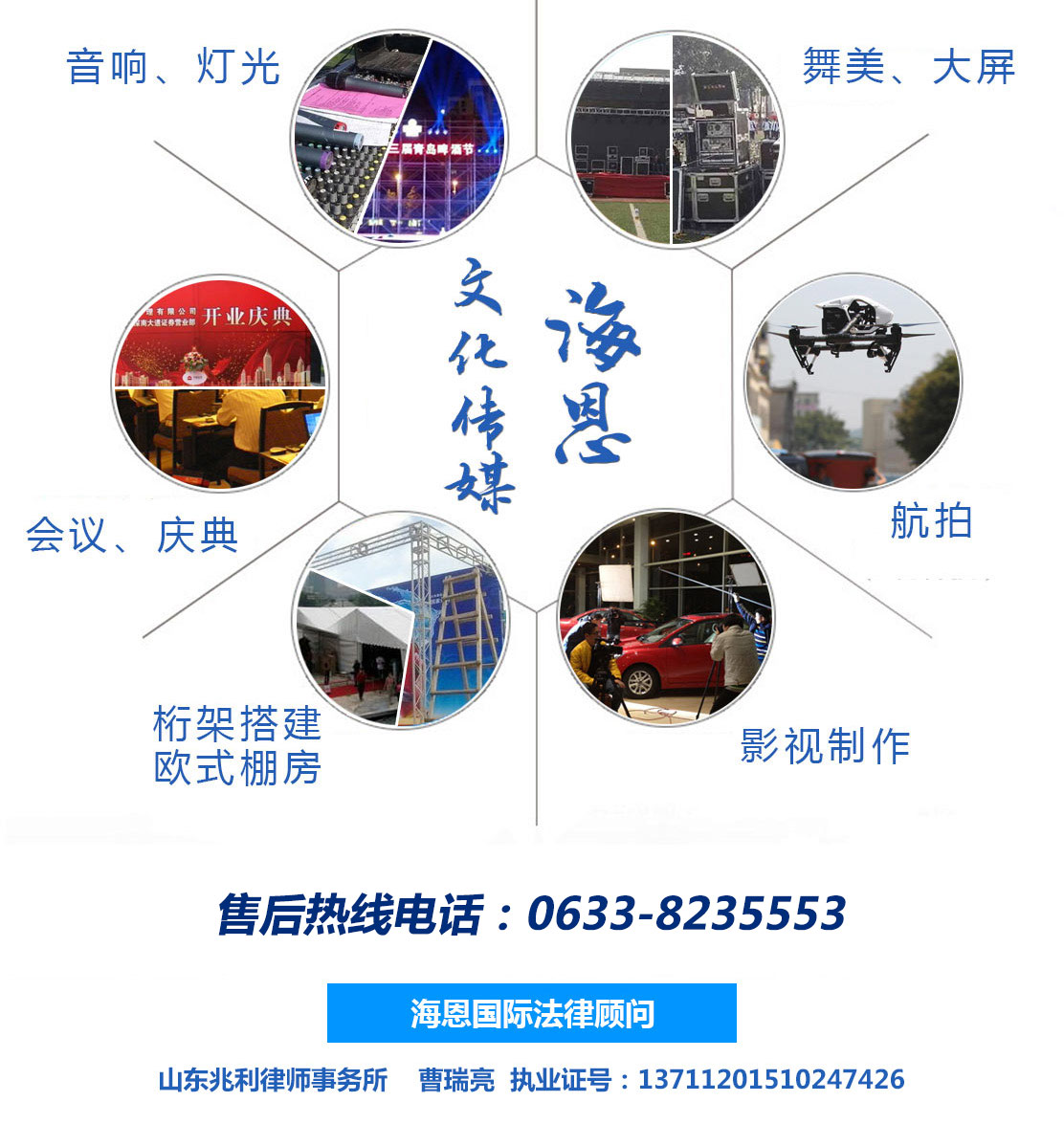 日照海恩國(guó)際展覽股份有限公司主要經(jīng)營(yíng):為文化藝術(shù)交流提供服務(wù),攝影攝像服務(wù),廣告圖文設(shè)計(jì),舞臺(tái)設(shè)計(jì),文化藝術(shù)交流策劃,舞臺(tái)藝術(shù)造型策劃,企業(yè)營(yíng)銷策劃,商務(wù)信息咨詢,會(huì)議服務(wù),展覽展示服務(wù),禮儀慶典服務(wù),廣告設(shè)計(jì)制作等產(chǎn)品。公司尊崇“踏實(shí)、拼搏、責(zé)任”的企業(yè)精神,并以誠(chéng)信、共贏、經(jīng)營(yíng)理念,創(chuàng)造良好的企業(yè)環(huán)境,以全新的管理模式,完善的技術(shù),周到的服務(wù),我們始終堅(jiān)...
